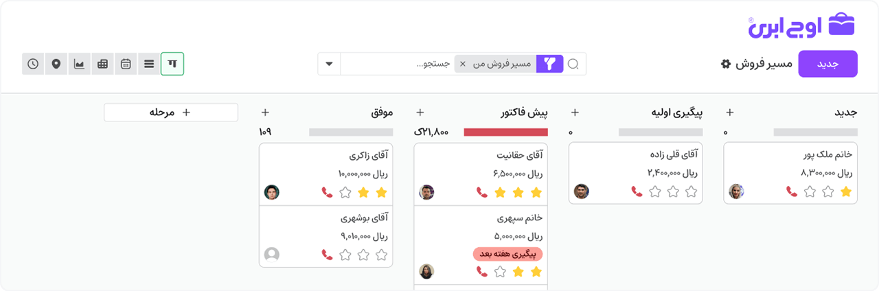 اوج ابری فرآیند فروش شما را استاندارد میکند، مشتریان جدید جذب میشوند و نرخ بازگشت مشتریان فعلی بالا میرود. گزارشهای دقیق به شما کمک میکند تصمیمهای بهتری بگیرید و همیشه جلوتر از رقبا باشید.