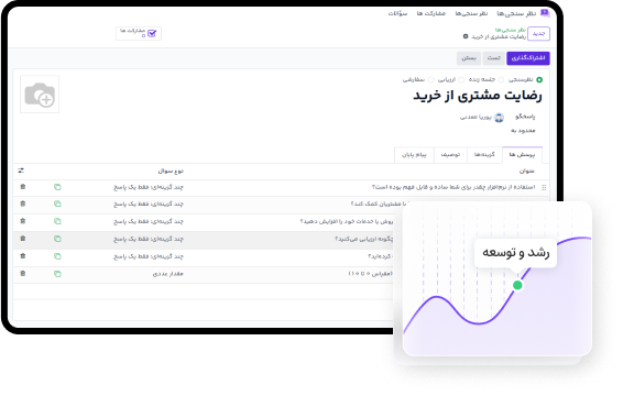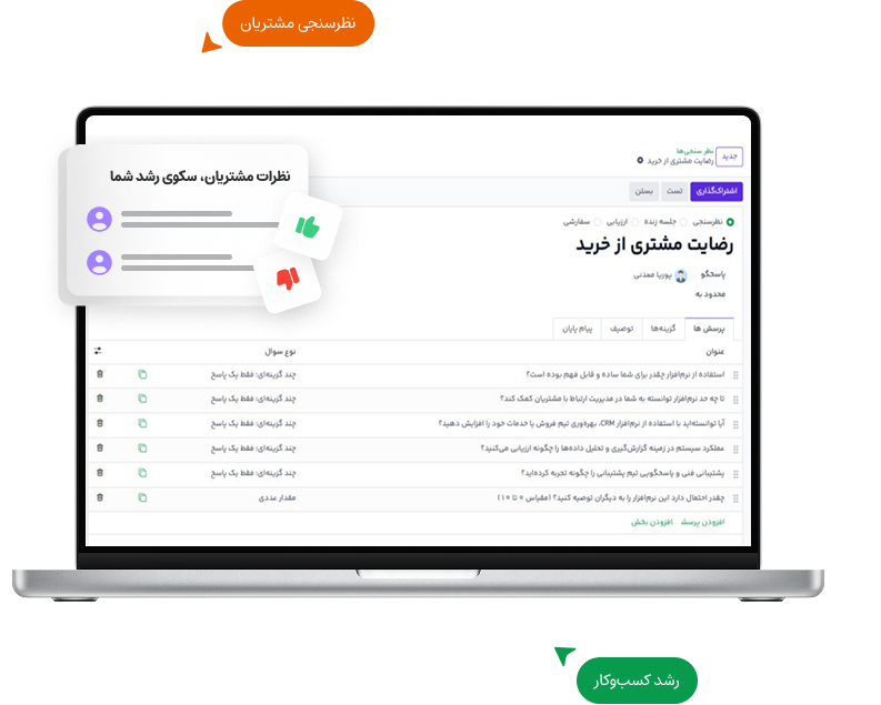 دیدگاه مشتریان خود را به فرصتی برای رشد تبدیل کنید. ماژول نظرسنجی به شما کمک می کند با دید کامل در مسیر موفقیت کسب و کار خود قدم بردارید.