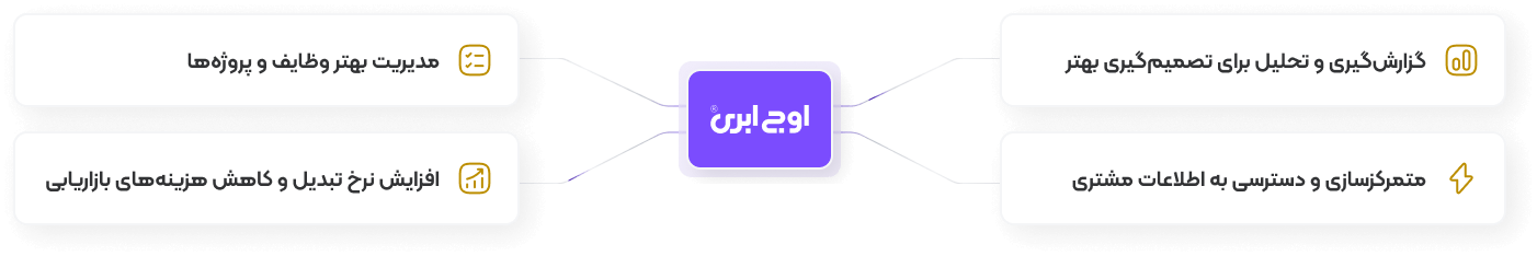 اوج شامل مدیریت مخاطبین، فرصتهای فروش، پیگیری معاملات، اتوماسیون بازاریابی و گزارشهای تحلیلی است. این امکانات هماهنگی تیمی و افزایش فروش را آسان میسازد.